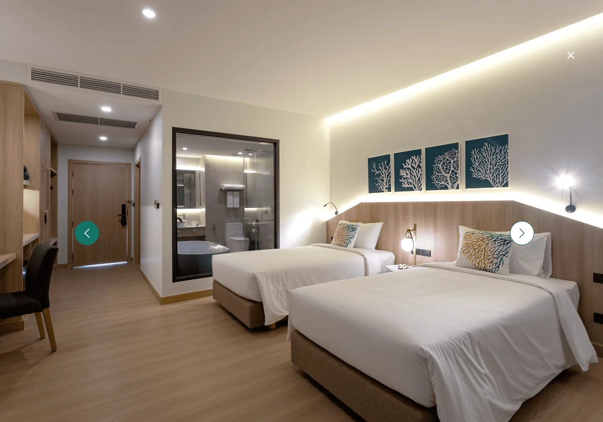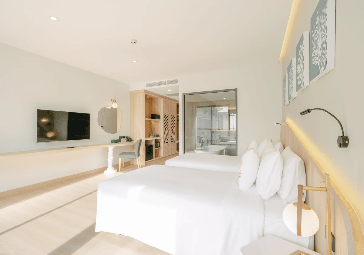 Our Deluxe Room is designed to provide the perfect blend of comfort and style. With refreshing views of Phuket’s natural beauty from your bed, private balcony, or soothing bath, you’ll find yourself surrounded by tranquility. The room is a sanctuary of relaxation, offering a seamless connection to the island’s stunning landscape. Whether you’re admiring the vistas from your bed, balcony, or while soaking in the luxurious bath, your holiday experience will be truly magnificent.